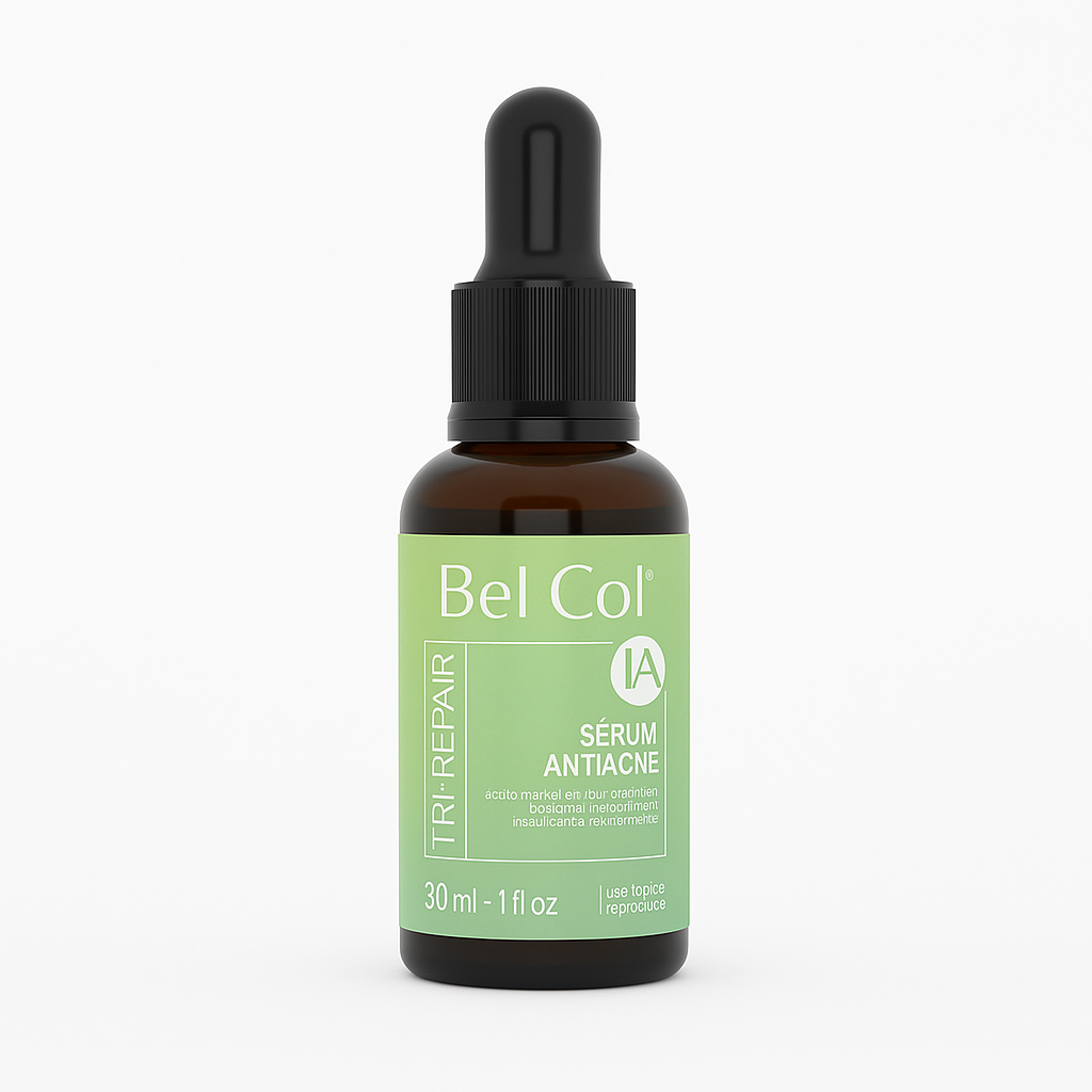 Sérum Antiacne Tri-Repair Bel Col, com tecnologia de ponta no combate à acne: o primeiro sérum com peptídeo desenvolvido por Inteligência Artificial que controla a oleosidade, reduz acnes, melhora o diâmetro dos poros, fortalece a barreira cutânea diminui marcas e previne novas lesões.
